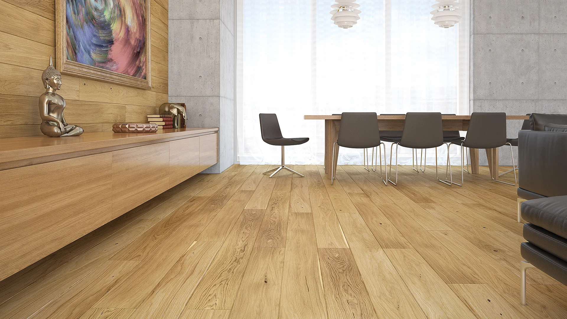 Moderní dřevěná podlaha, která splňuje trend současného interiéru a to zejména svými přednostmi jakými jsou velké rozměry, šířka lamely 207 mm, tlumené barvy a přirozenost, která je zdůrazněna povrchovou úpravou přírodními oleji nebo matným lakem. Struktura pravého dřeva je podtržena kartáčováním a fázovanými hranami, vrchní nášlapná vrstva má tloušťku 3,2 mm.